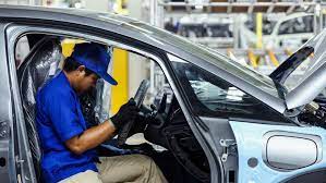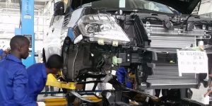 A worker fits parts to the engine bay of a Hyundai Motor Co. Accent automobile on the production line at the Stallion Group vehicle assembly plant in Lagos, Nigeria, on Wednesday, Feb. 17, 2016. With the economy growing at barely half 2014's 6.3 percent, a recession can't be ruled out this year, according to Morgan Stanley. Photographer: George Osodi/Bloomberg